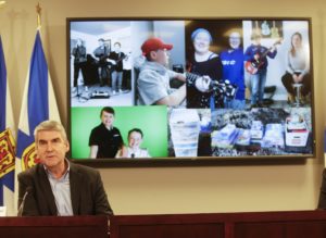 省长斯蒂芬·麦克尼尔坐在照片前,这些照片展示了新斯科茨人是如何享受居家生活的。图片:通信新斯科舍省。