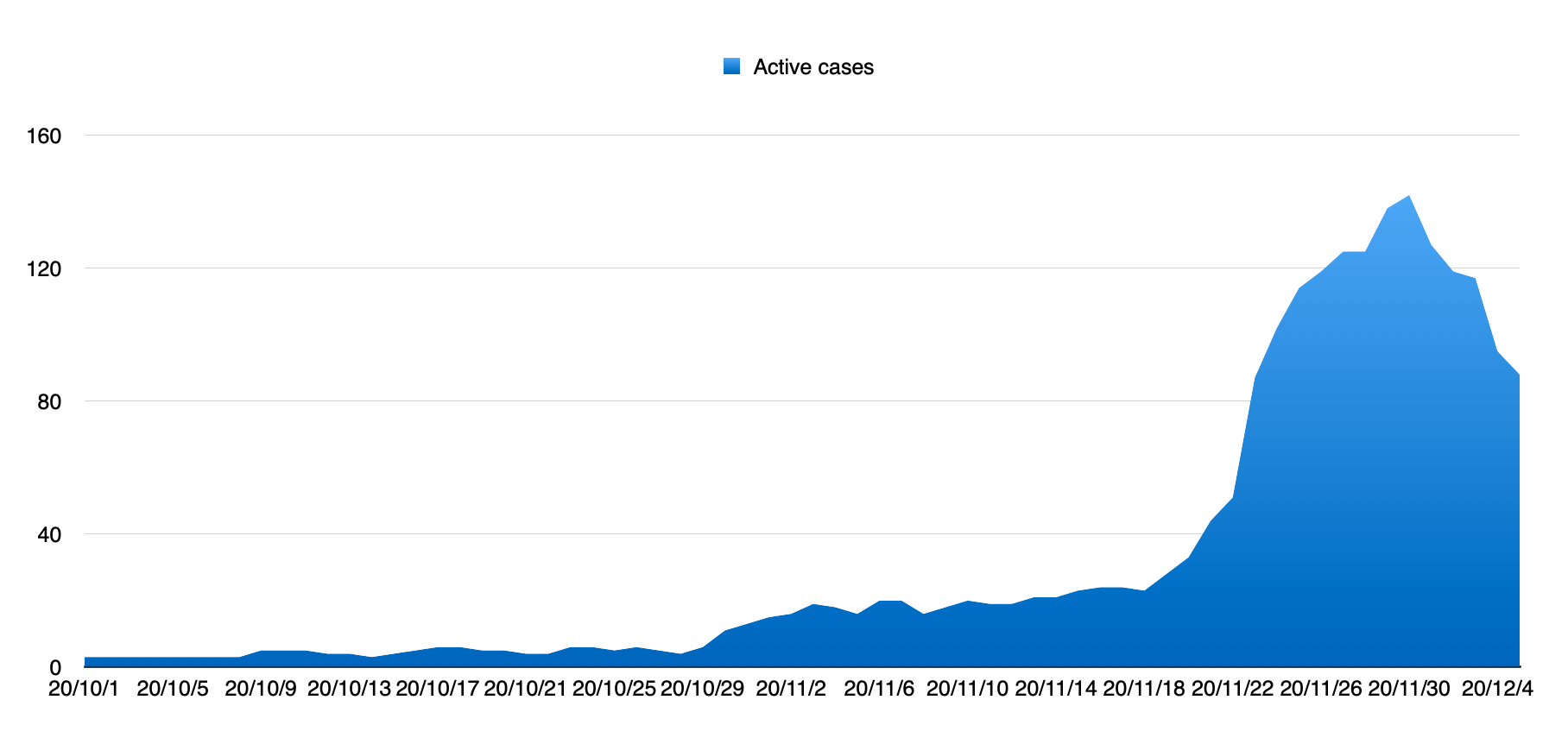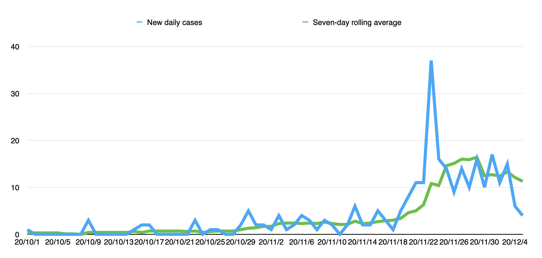 以下是第二波疫情开始(10月1日)以来的每日新增病例(不包括昨天的学校病例)和七天滚动平均值: