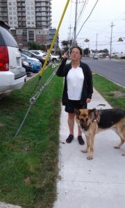 Milena Khazanavicius和她的导盲犬Louis站在Young Street的男子铁丝网旁。Khazanavicius要求市政府修复这条导线,因为导线太低,对盲人和视力不全的人来说很危险。黄色的套管最终被套在了电线上,但还是太低了。照片:米Khazanavicius