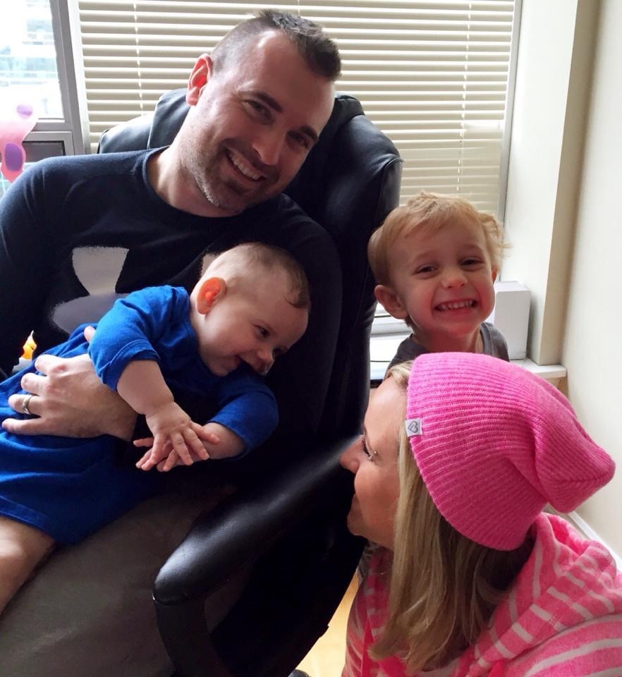 Matt Dort与他的女儿Bria于2014年12月从医院发布后,当她10个月大的时候,仍在饲养管上。她的头已被剃须在ICU中施用紧急药物,而马特剪了他的头发。Braxton位于右侧,亚特的堂兄,布兰妮在前景。照片:贡献