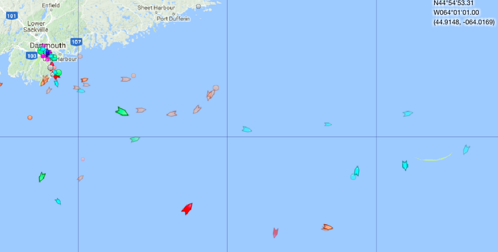 今天早上7:30,哈利法克斯海岸有很多活动。多个供应船(Teal Colored Boats)正在围绕沙洲岛屿的海上行动,而渔船(粉红色)向西工作。绿色船是YM精华,今天早上离开了Fairview Cove。红船是Toftenviken,一艘通过油轮。地图:Marinetraffic.com.