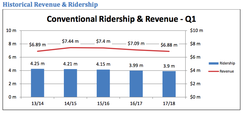 自2013年以来,乘客低于八百百分点。2014年收入增加,由于公交车票的35美分,但自2014年高度以来,总线收入减少了超过七百万美元 - 大约七分半。