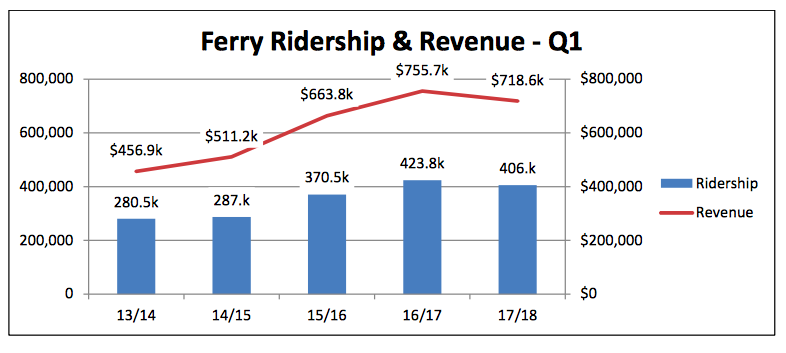 But the increase in ferry numbers the last few years hasn’t been enough to offset the decrease in bus ridership and revenues, and year-to-year, total transit revenue for the first quarter is down $460,000, from a high of $8.13 million in 2015 to $7.67 million this year.