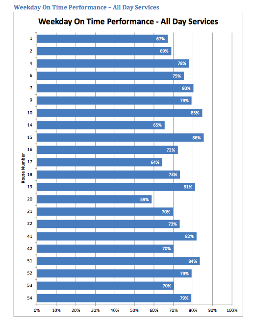 Wannabe Riders的一个大问题是巴士时间表根本不可靠。Halifax Transit首次报告其准时性能,解释: