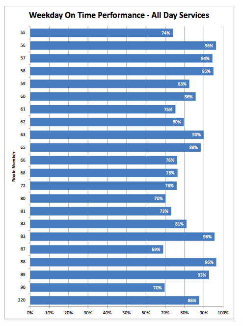 以下是所有路线的完整时间绩效编号,整天(您可以深入钻入高峰时段数据在这里):