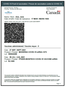 加拿大疫苗接种证明现在对新斯科舍省人可用。在许多非必要的服务中,出示疫苗接种证明现在是强制性的。