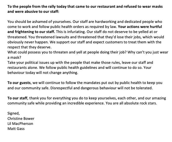 在The Wooden Monkey的第一天很顺利,这家店在哈利法克斯和达特茅斯都有分店。但周日下午,哈利法克斯分店的员工遇到了难缠的顾客。周日晚上,这家餐厅的共同老板里尔·麦克弗森和克里斯汀·鲍尔在他们的Facebook和Instagram页面上分享了这条社交媒体帖子。