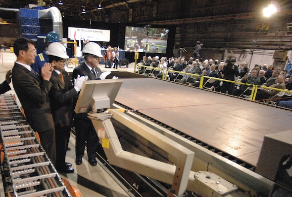 2011年工厂开业。从左至右依次为DSTN代表李南基、大宇造船海洋社长南相泰、总理德克斯特。图:新斯科舍省政府