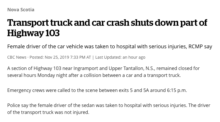 这是一个屏幕CBC新闻部件在103号高速公路昨晚的坠机上。一个女人在这一碰撞中受到严重伤害,但标题是指高速公路的临时关机,让“用严重伤害所带来的医院”,朝向子头。这是背叛和加强错位值的那种东西。Nova Scotia的任何奇迹是谁,并且在103岁的时候,像他们一样开车?
