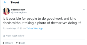 我决定不使用这些照片。我知道人们可以不把他们的照片上传到社交媒体做善事和善良的行为,但这些照片让我思考我们如何在社交媒体上记录我们的慈善行为。在我们的社会中,最脆弱的人是饥饿和无家可归的人,人们不应该把食物银行或避难所作为拍照的舞台。这是一种投机取巧的卑劣行为。这让我想起了去年12月的一条推特,当时英国保守党议员因在当地食品银行拍摄节日照片而受到批评。