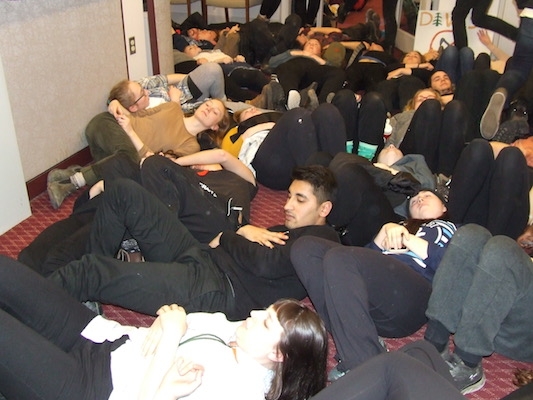 会议结束后,当坎贝尔离开大楼时,学生们上演了一场“死在”,代表气候变化的受害者。学生们在下午6点结束了对大楼的占领。