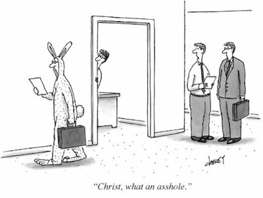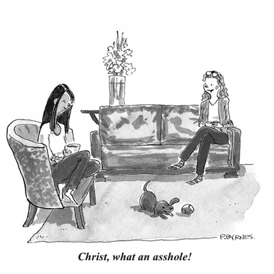 但说到特朗普,有一个老噱头(由博主查尔斯拉莫伊),“任何《纽约客》的漫画都可以配上‘天哪,真是个混蛋!’而又不失喜剧价值。”下面是拉沃伊使用的几个例子: