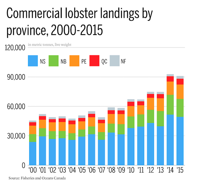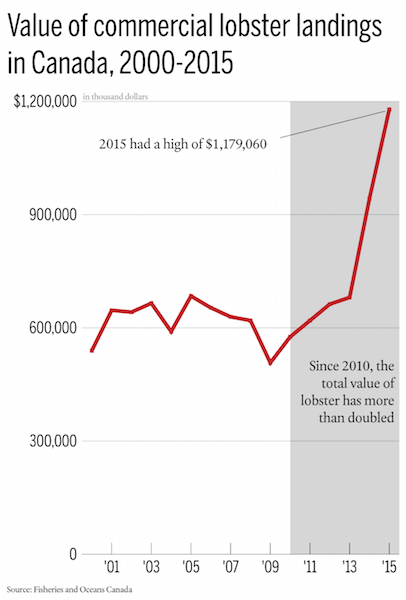 我认为它比这更复杂。首先,“变暖海洋”正在向北移动龙虾渔业。长长的缅因州海岸,曾经是富有成效的龙虾地面现在没有龙虾.此外,如果我理解正确的话,新斯科茨水域的龙虾也改变了它们的迁移模式,比以前更早地进入近岸地区,这增加了近岸龙虾船的捕鱼量。