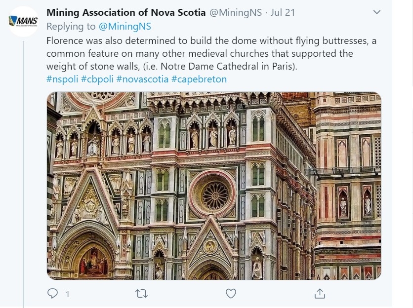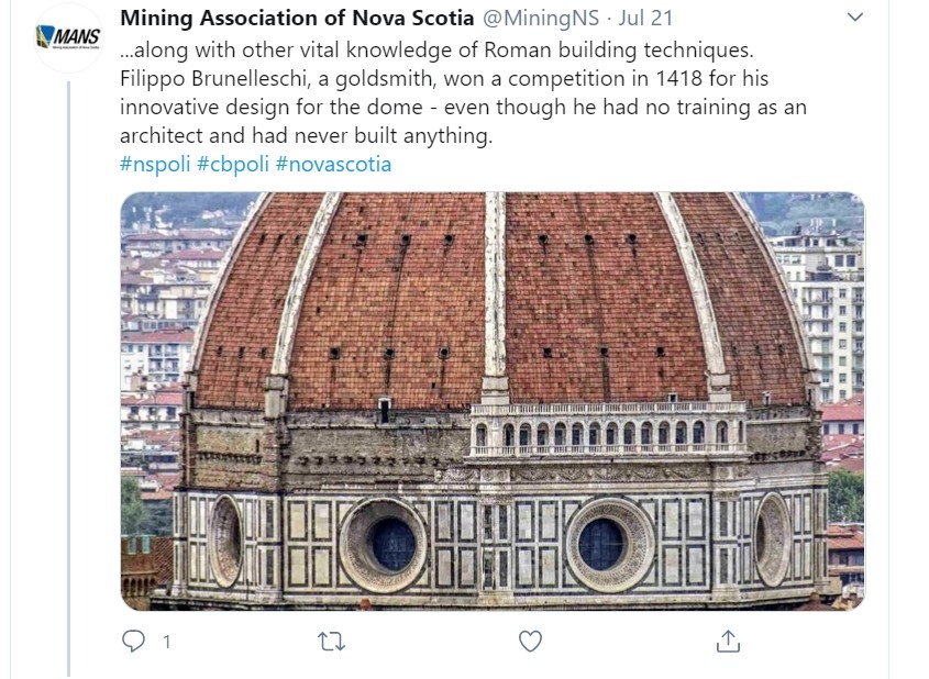 顺便说一下,新斯科舍省矿业协会的推特消息很不错。最近的话题包括采矿如何影响毕加索的绘画,以及对佛罗伦萨花圣玛丽大教堂的建造的长篇解释,以及一些非常奇怪的标签选择。