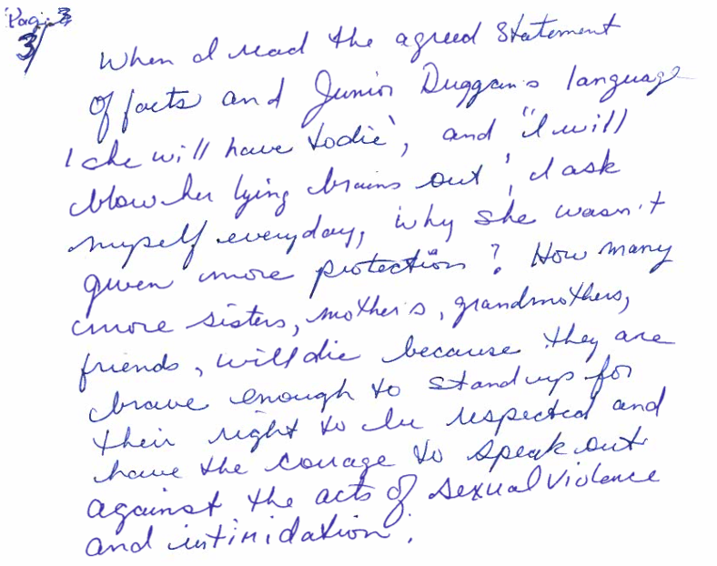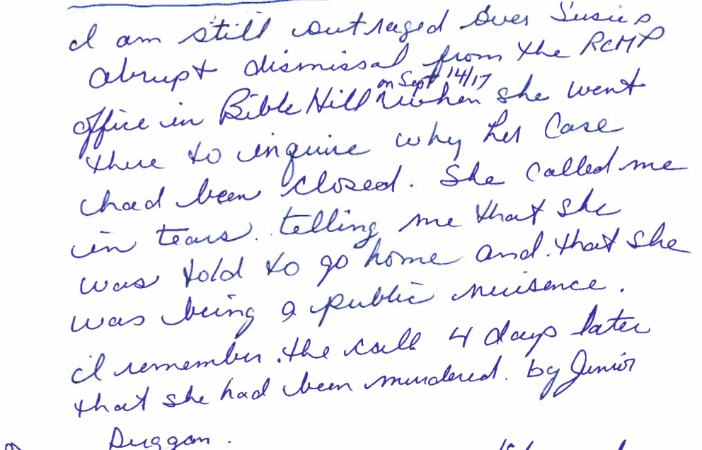 我对苏茜2017年9月14日突然被皇家骑警在圣经山的办公室解雇感到愤怒,当时她去那里询问她的案件为什么被结案了。她哭着打电话给我,告诉我她被要求回家,说她是一个公害。我记得四天后接到电话说她被朱尼尔·达根谋杀了。我知道她担心自己的生命安全,也担心9月17日早些时候她作为寄宿母亲收留的两个十几岁女交换学生的安全,因为她在8月30日/ 17日在法庭上提交的拨款[原文如此]。她告诉我的。