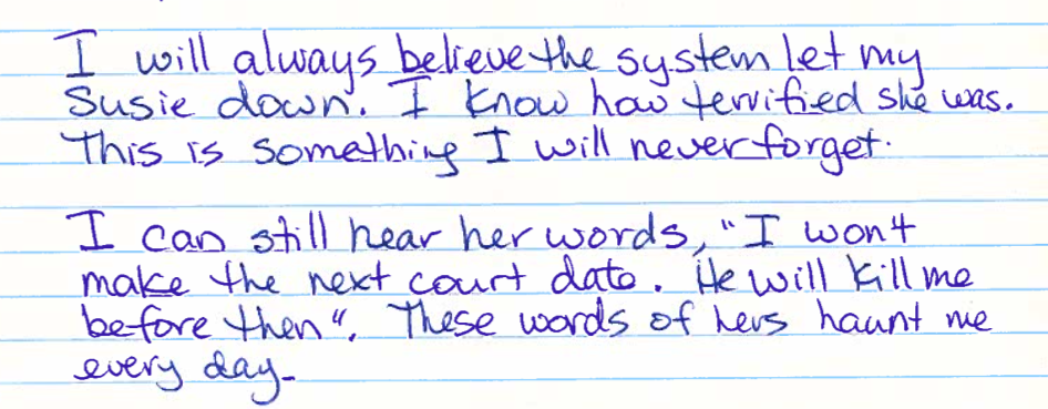 当我读到商定的事实陈述和小杜根的措辞“她必须死”和“我要把她撒谎的脑袋打爆”时,我每天都在问自己,为什么她没有得到更多的保护。“有多少姐妹、母亲、祖母和朋友会因为她们勇敢地捍卫自己的权利而死去,因为她们有勇气站出来反对性暴力和恐吓行为。”我永远相信这个制度没能保护苏茜免受小杜根这种人的伤害。我希望能采取更多措施保护她。