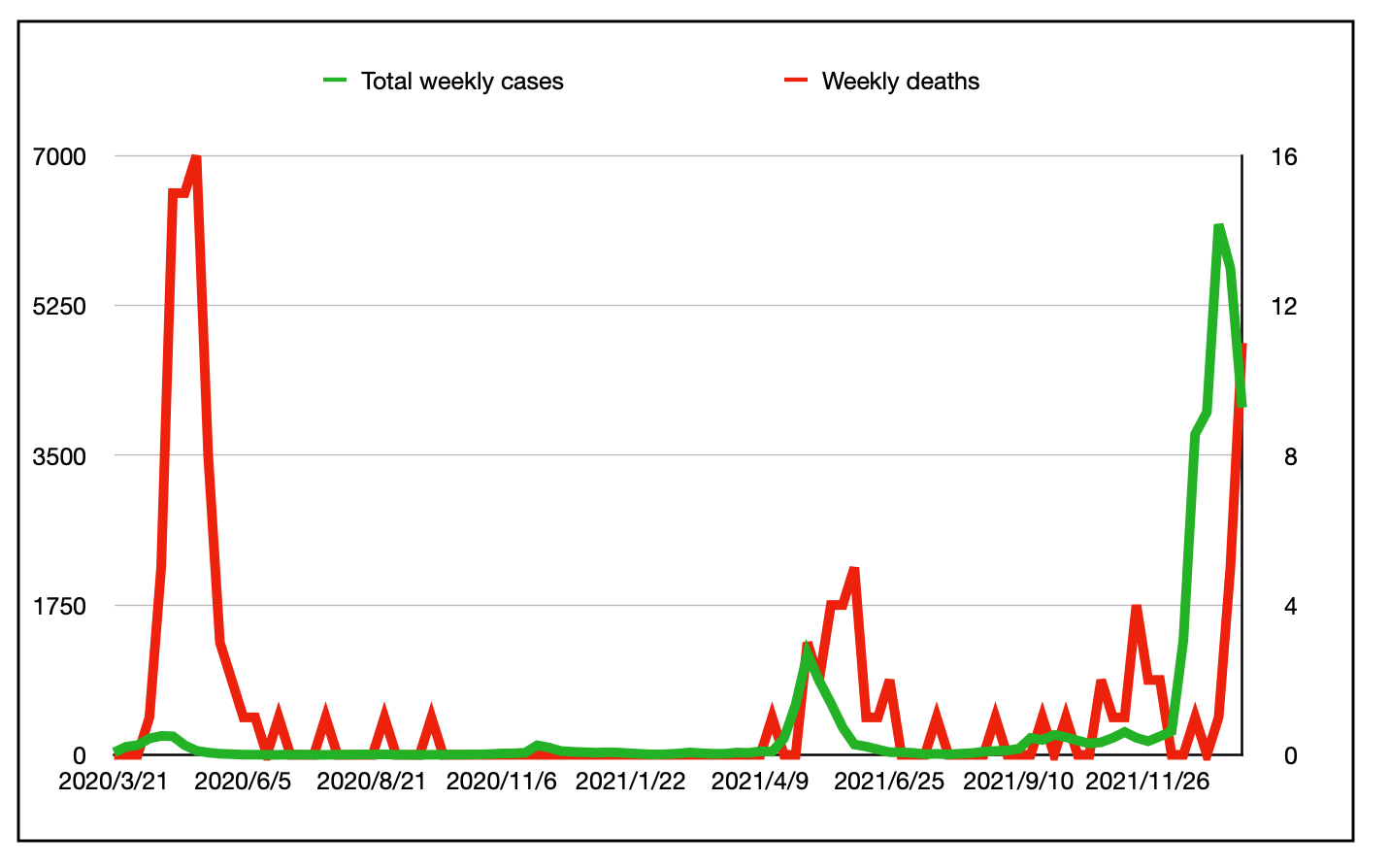 上面的图表显示了每周病例数(绿色,左轴)和每周死亡人数(红色,右轴)。如果死亡病例比发病时间晚三周,我们五月(没有什么是确定的)未来几周会有10-20人死亡。