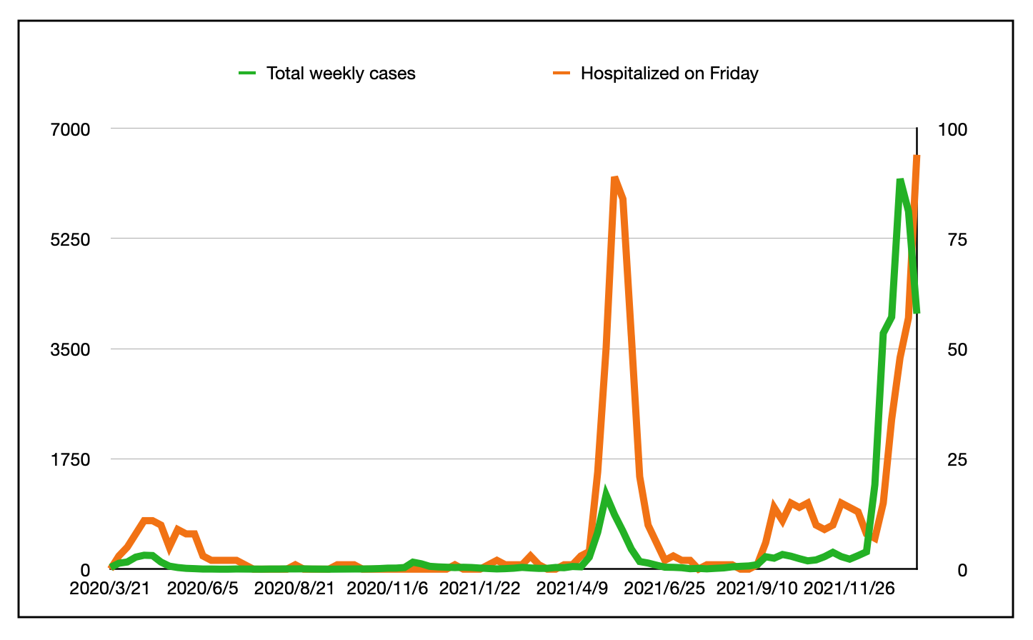 上图显示了疫情期间每周病例数(绿色,左轴)和周五住院人数(橙色,右轴)。