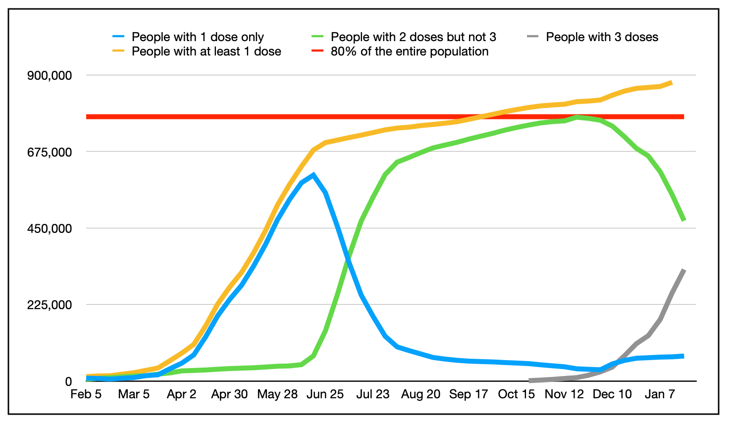 上图显示了流感大流行期间每周五的疫苗接种进度,本周周四除外。黄线代表的是至少蓝线代表的是只有一剂。绿线表示服用了两剂而不是三剂的人。灰色的线是三种剂量的人。红线代表80%的人口。