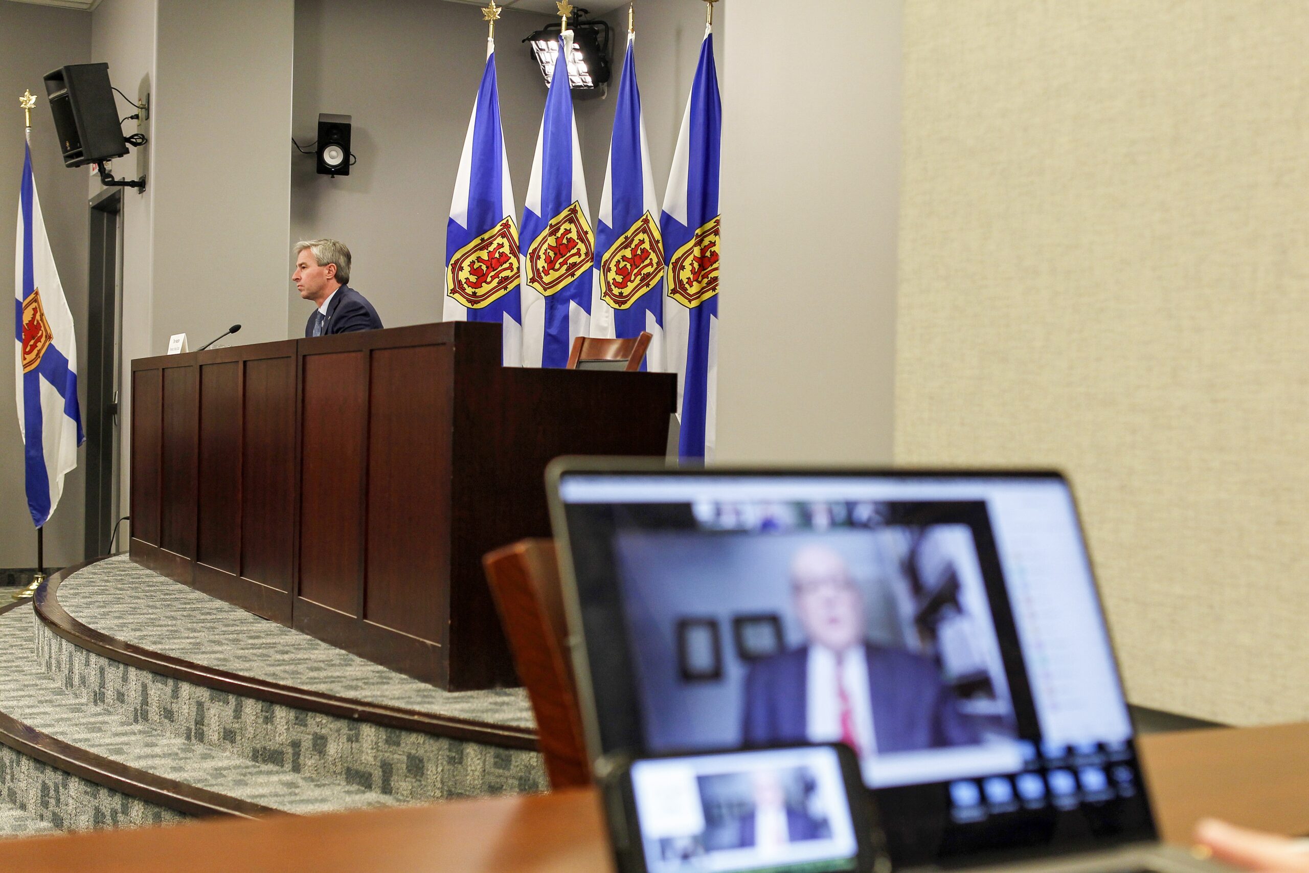 2022年1月29日,总理蒂姆·休斯顿(在媒体室)和卫生首席医疗官罗伯特·斯特朗博士(远程)在COVID - 19情况通报会上。图片来源:新斯科舍省通讯公司