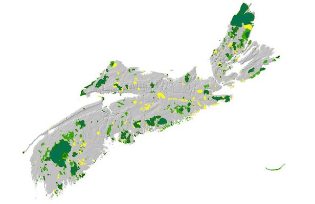 新斯科舍保护区地图。深绿色是现有的保护区。浅绿色为《我们的公园和保护区计划》中受法律保护的保护区。黄色区域是《我们的公园和保护区计划》中尚未得到保护的100个地点。地图:加拿大公园和荒野协会