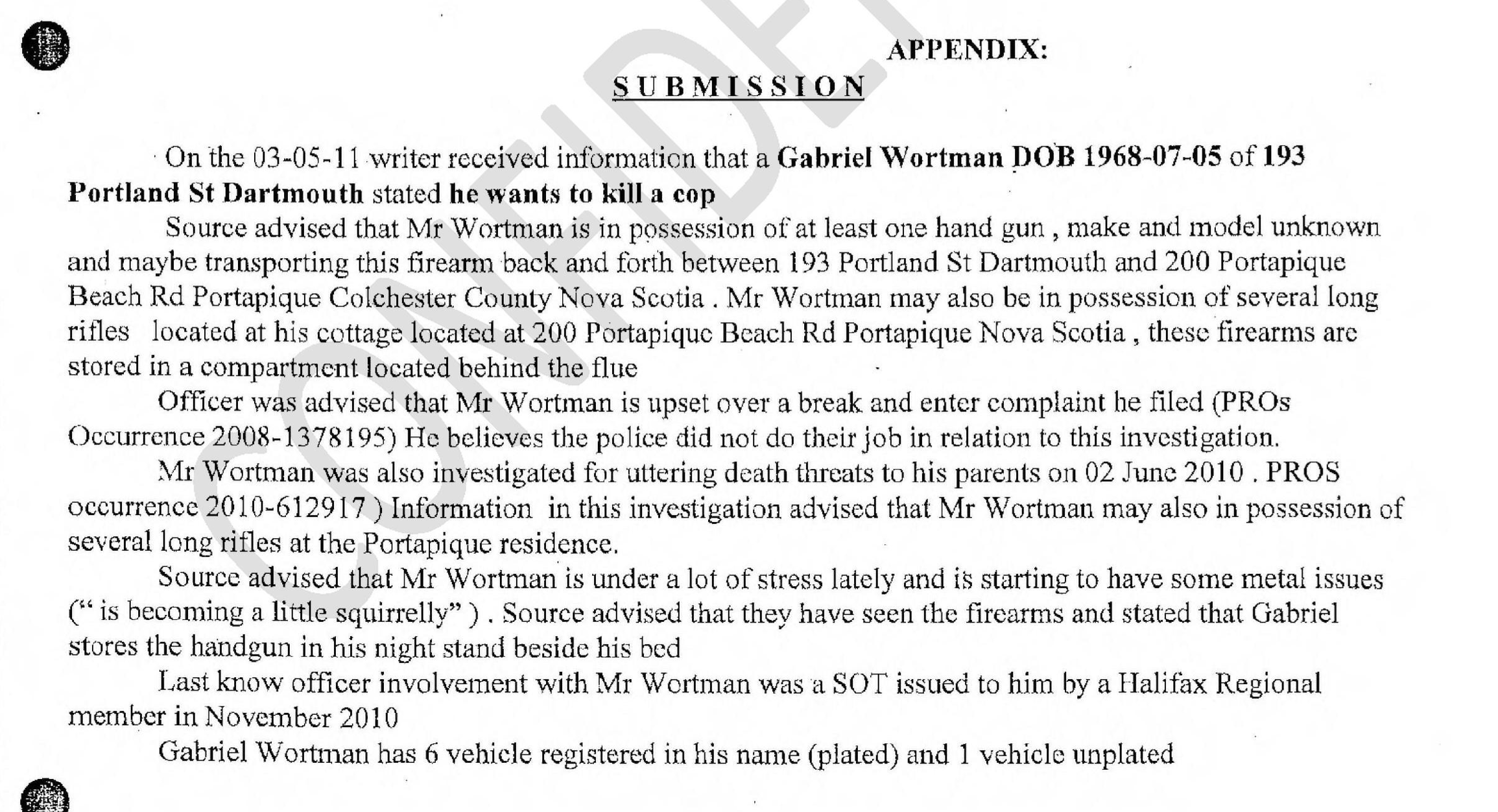 威利还对他与2020年4月18日至19日杀死22人的男子的几次会面有详细的记忆,哈利法克斯观察者称此人为GW。威利还记得2008年他第一次拜访位于波特皮克的乔治华盛顿大学,当时乔治华盛顿大学报警称他的车库工具被盗。威利记得GW后来给他回了电话,告诉了他小偷嫌疑人的名字。