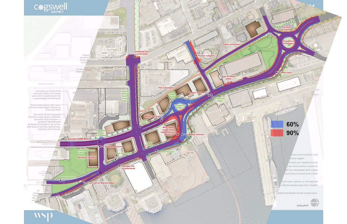如果你一直在关注考斯韦尔的设计过程,你会注意到这里有一个相当大的变化,相比2018年6月委员会批准的60%的设计图纸:少了一个迂回路口。根据Gehl建筑事务所的建议,更南部的市中心环形交叉口已经被巴林顿和上水街的常规T路口所取代。