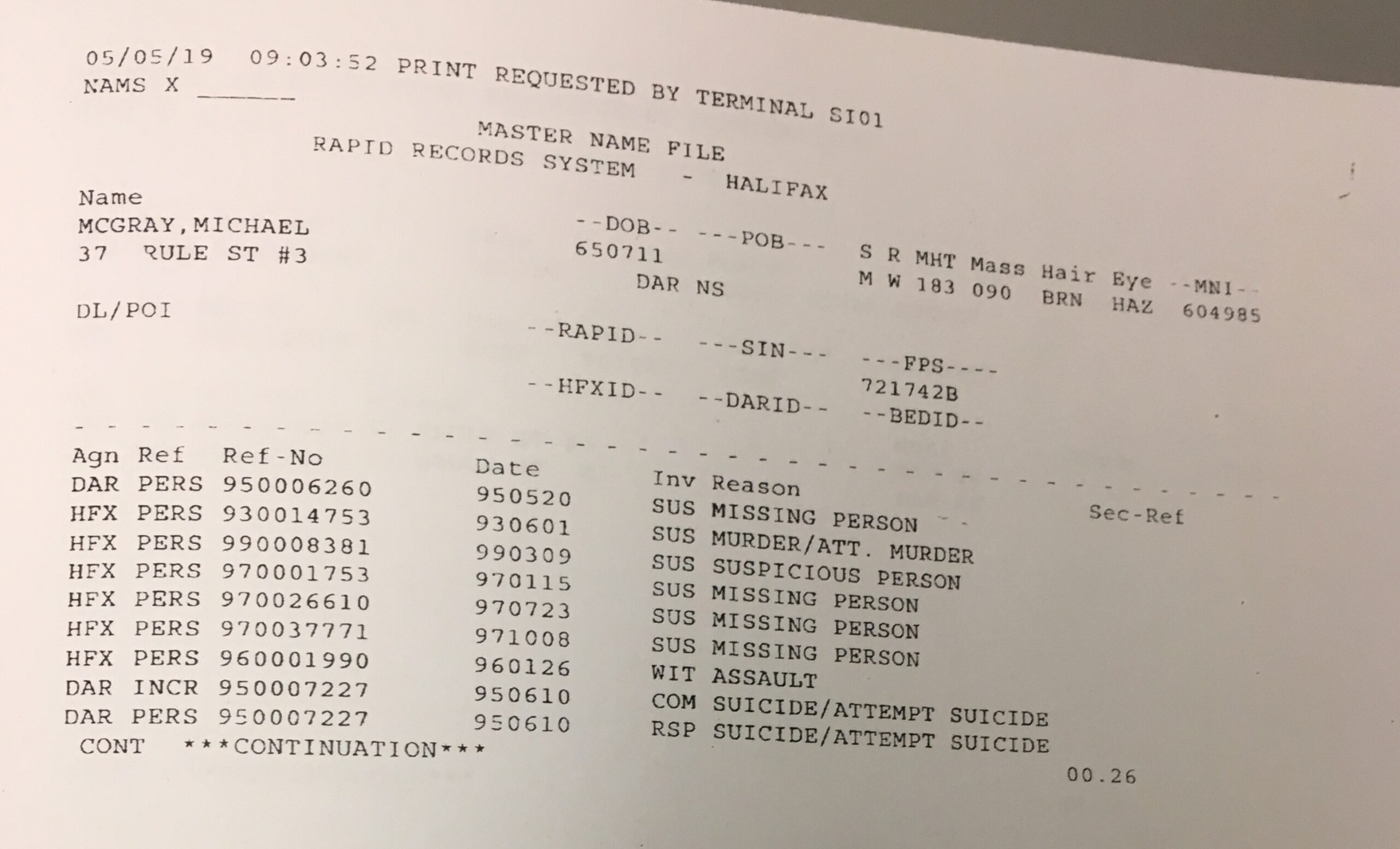 迈克尔·麦格雷(Michael McGray)的警察记录,由哈利法克斯地区警察汇编