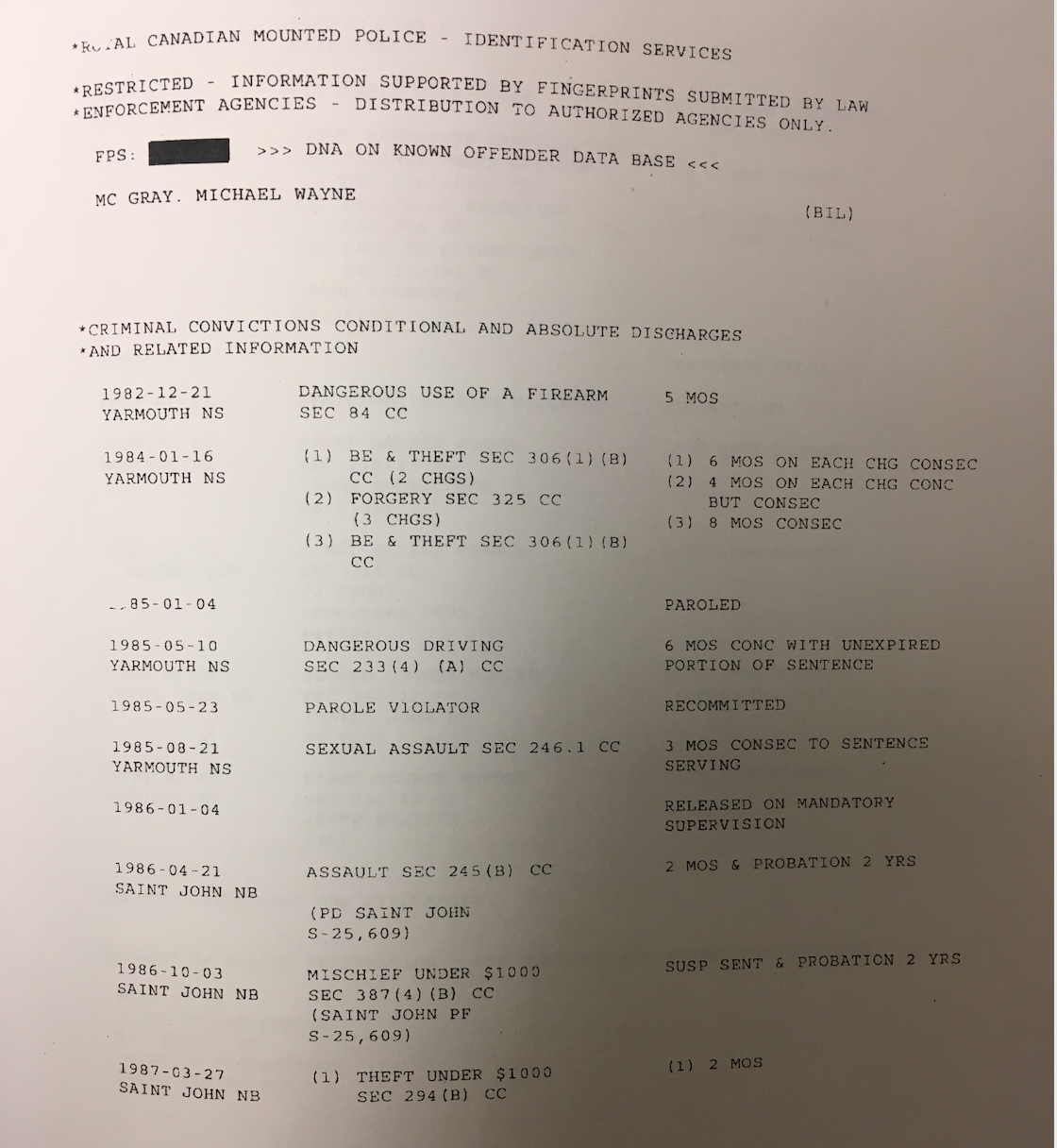迈克尔·麦格雷(Michael McGray)的警察记录由加拿大皇家骑警(RCMP)编写。