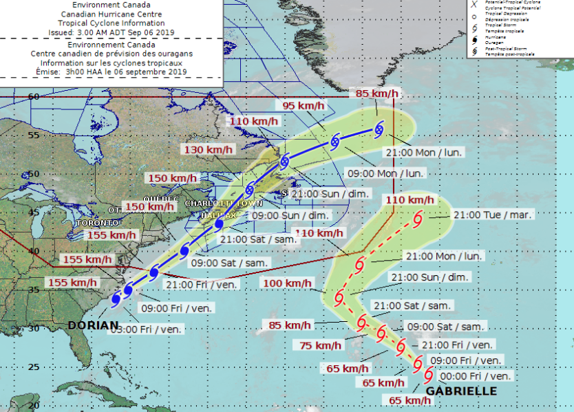 加拿大环境部9月6日凌晨3点发布了飓风轨迹预测。预计多里安将于周六晚上袭击哈利法克斯。