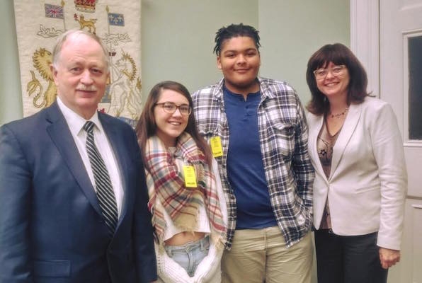 10月份,学生Kenzi Donnelly(左边的第二个)和Che Morales(从左三分之二)去了立法机关,并遇到了MLAS Keith Colwell(左)和乔伊斯Treen(右)。照片:教师Facebook页面的学生