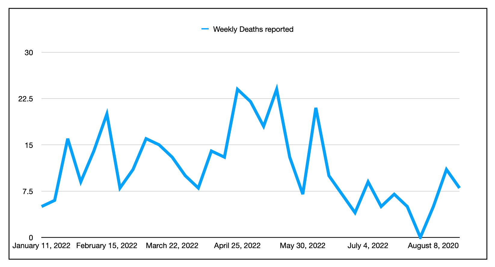 自1月以来,每周都报道了新斯科舍省的COVID死亡人数。请注意,由于报告期的变化,截至4月11日的一周只有6天。