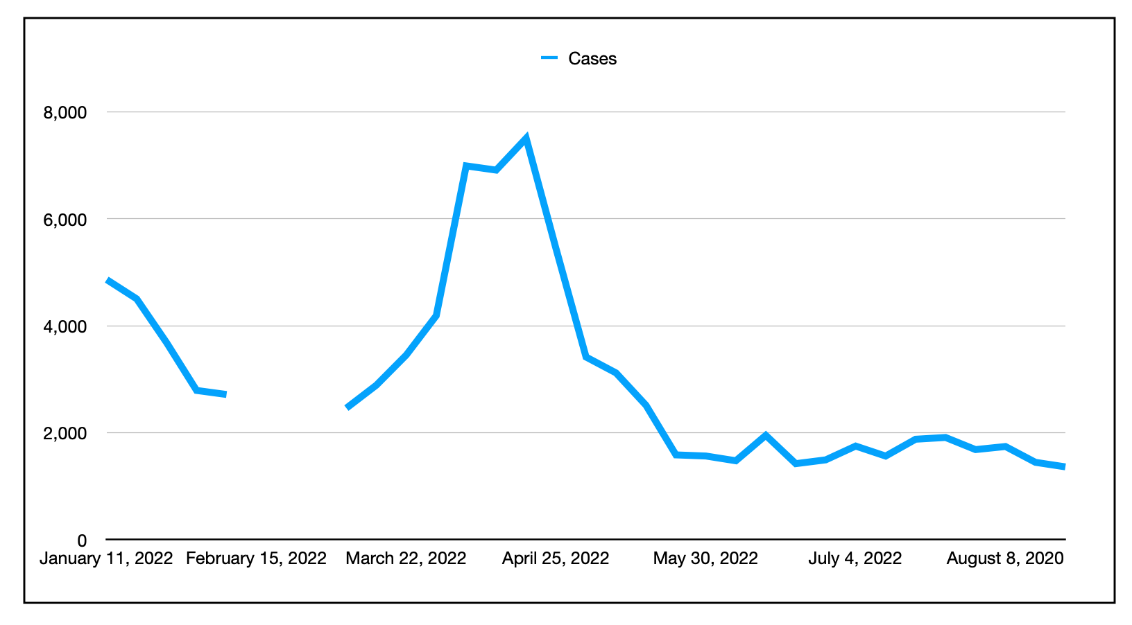 1月以来每周新增(实验室确认)病例数。这一差距反映了测试协议的临时变化,使得每周的比较变得毫无意义。由于报告周期的变化,截至4月11日的一周只有6天。