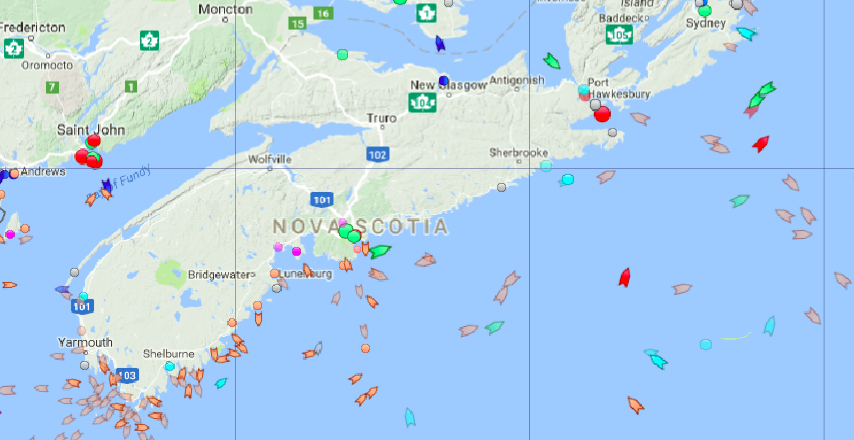 周一上午9点,新斯科舍省附近的海域。地图:marinetraffic.com