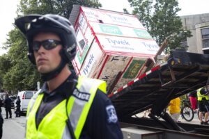 2021年8月18日,哈利法克斯地区警察阻止抗议者,避难所被安置在平板拖车上。照片:赞恩伍德福德