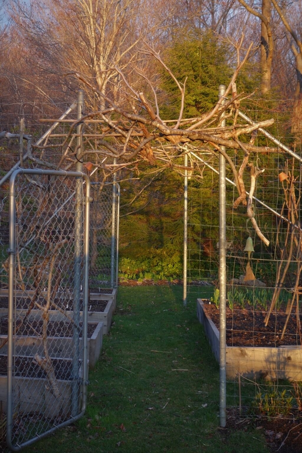 这里有一个小案例,说明我是多么容易被逗乐。几年前,我们安装了一个小围栏,让我们可以种植一些蔬菜,免受鹿的破坏。铁丝有八英尺高,但门要短一些,所以我开始用奇形怪状的树枝组装拱门。新树枝一长出来就添上了,旧的就烂掉了。在我看来,这个装置就像在狩猎小屋里看到的鹿角。从我的角度来看,这是一个很好的外观。