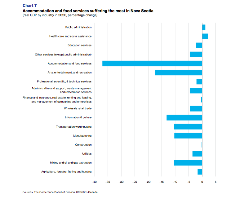 新斯科舍省经济将在2020年的录音3.8%上缩小,由冠状病毒大流行和由此产生的省和全球经济停工而下拉。跨行,住宿和食品服务部门将遭受迄今为止旅行禁令和物理疏远措施遭受殴打的最大损失。(见图7.)跨行业的大规模裁员今年将飙升,导致该省的失业率超过11% - 过去二十年的最高利率。因此,随着Nova斯科特人的经济不确定性和大流行的影响,家庭消费和商业投资将在近期举行。