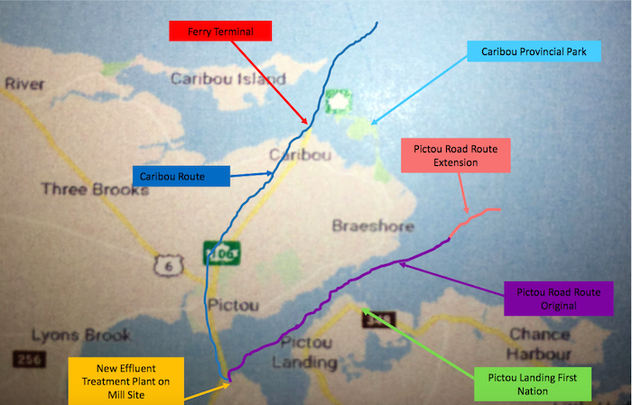 几周前,纸浆工厂的官员会见了Pictou着陆第一民族官员和渔民的协会,详细介绍了原始路线发现问题后的新拟议路线。