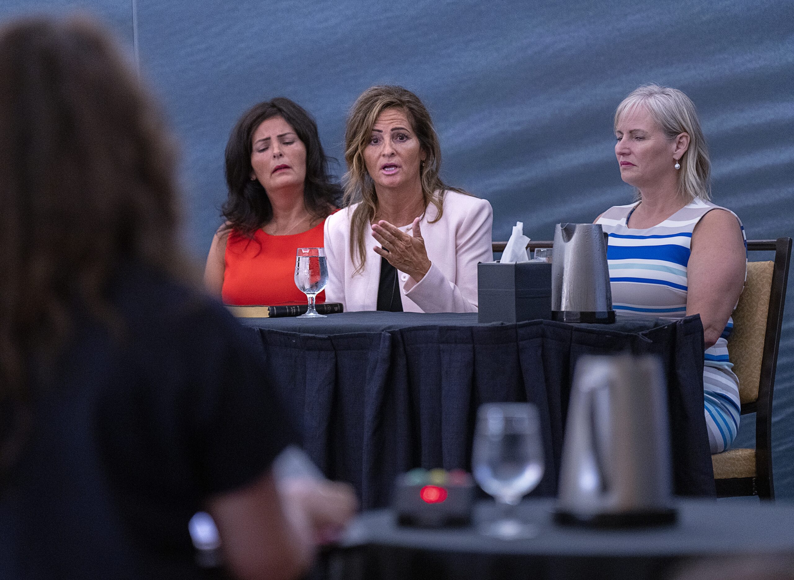 Lisa Banfield is flanked by her sisters Janice (left) and Maureen (right) as she testifies at the Mass Casualty Commission inquiry into the mass murders in Nova Scotia on April 18/19, 2020, in Halifax on Friday, July 15, 2022. Photo: THE CANADIAN PRESS/Andrew Vaughan
