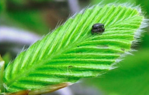 这种昆虫是欧洲本土的,叫做山毛榉采叶象鼻虫。成年象鼻虫将卵产在幼叶上,并产生幼虫,幼虫会吃透树叶。