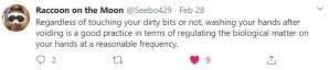 你觉得洗手很奇怪吗?有这样一群人(我怀疑他们大部分和互认协议和incels有重合),在常见的地方可以找到,他们在拉完便便后拒绝擦拭,因为他们认为摸自己的屁股会让你成为同性恋。我希望我是在开玩笑。