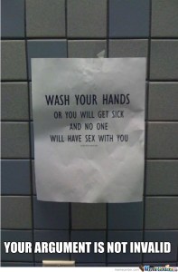 即使你相信你的阴茎在把它放在(或不)内衣(也包括身体的其他部位,汗水和潜在的爬行动物)后非常干净,你的手也不干净。你怎么开门?也许可以推一下肩膀来避免细菌?你进厕所之前在做什么?抓你的耳朵吗?挖鼻孔?在成百上千的人之后处理零售商品?触摸自动扶梯扶手、电梯按钮或公共汽车上的皮带?开着你的车,你的方向盘收集了你打喷嚏时从体内排出的所有细菌?公共厕所的水槽——或者你家里的水槽——是为每个人的健康迈出一小步的完美地方,而不仅仅是你自己。 Wash your palms, the backs of your hands, between the fingers, finger tips and thumbs. 30 seconds. Dry with paper towel, and use the towel to push the door open as you leave. Dump the towel in the next trash can. Now, you can’t say no one told you.