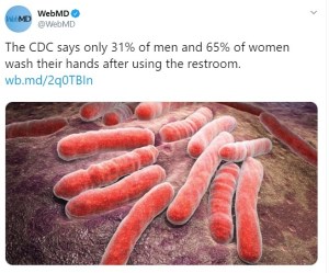 上周末,我了解到,并不是所有的男性在离开公共厕所时都会洗手。美国疾病控制中心的一些统计数据在推特上流传只有31%的男性在使用公共厕所后洗手,而只有65%的女性会这样做.包含这些数据的推特是在2018年发布的,但现在又流行起来了。