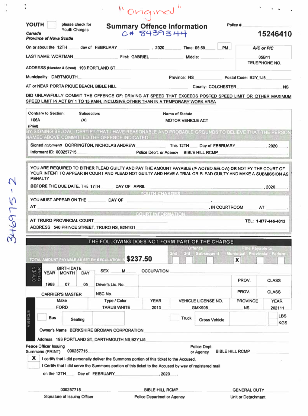 然而,乔治王子当天下午5点59分在Portapique海滩路被皇家骑警成员尼古拉斯·安德鲁·多灵顿开了一张超速罚单。GW被指控超速1-15公里。罚款是237.50美元。如果他希望不认罪,法庭将于2020年4月17日在王子街的特鲁罗法院开庭。随附文件显示乔治华盛顿大学打算不认罪。以下是转交给法庭的关于这张罚单的信息: