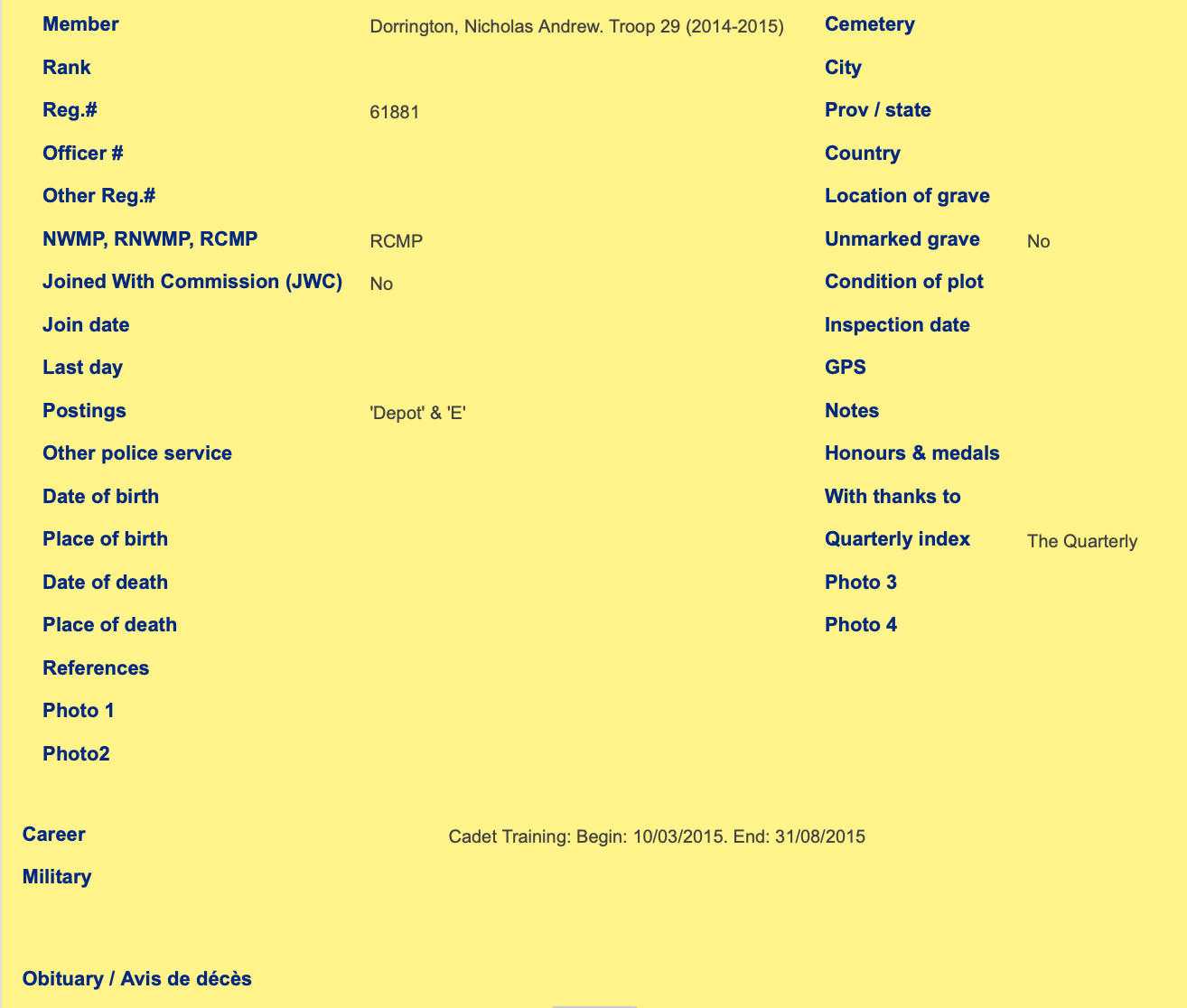 在网上搜索没有发现多灵顿是皇家骑警的现役军官。但是在网站上皇家骑警的坟墓搜索结果显示这是一个名叫尼古拉斯·安德鲁·多灵顿的皇家骑警成员的信息。他的徽章或团号是61881。关于他的信息很少,只知道他在里贾纳的皇家骑警训练中心迪普呆了五个多月,并于2015年8月31日被分配到不列颠哥伦比亚省的“E”部门。我们不知道他什么时候出生,什么时候和怎么死的。他好像在什么地方有个标记的坟墓。网站上说关于多灵顿死亡的信息来自的季度,皇家骑警退伍军人协会的官方杂志。《验尸官》找不到其他关于尼古拉斯·安德鲁·多灵顿的讣告或死亡通知。