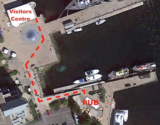 新斯科舍省旅游局的游客信息中心不是“隔壁”。它离这里225英尺远,隔着一条船道,越过下一个码头,沿着一条经常挤满了人的木板路。