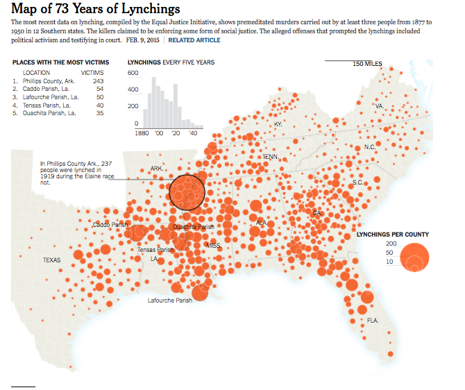 沿着吉姆乌鸦队是KKK和Lynching的持续恐怖主义。2177年至1950年间,平等司法倡议已在12名南方统一中记录了3,959个局势 - 并提出了数据这个图表: