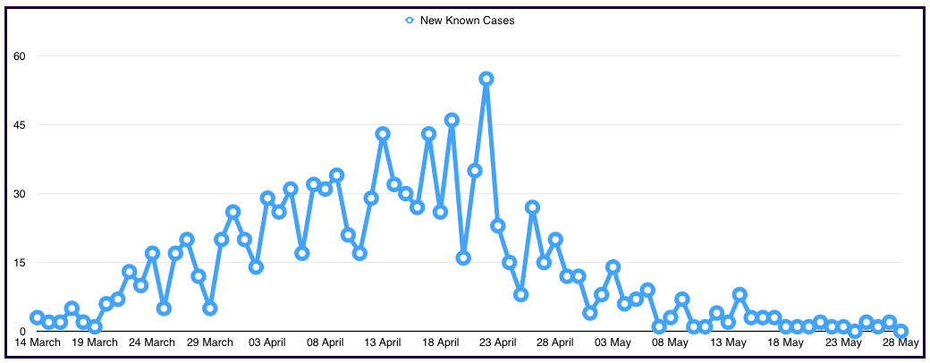 3月15日,新斯科舍省公布了已知的前三例COVID-19病例,前一天进行了检测。自那以后,每天都有新的病例公布,4月22日创下了55例的单日新高。自5月4日以来,每天的新增病例数一直在个位数,最后,今天,自新斯科舍省爆发疫情以来,昨天宣布零新增病例。