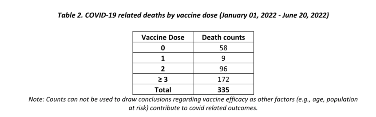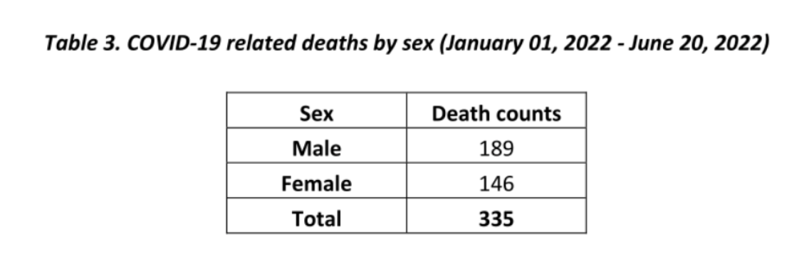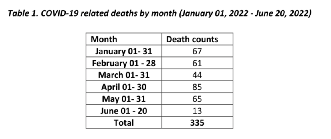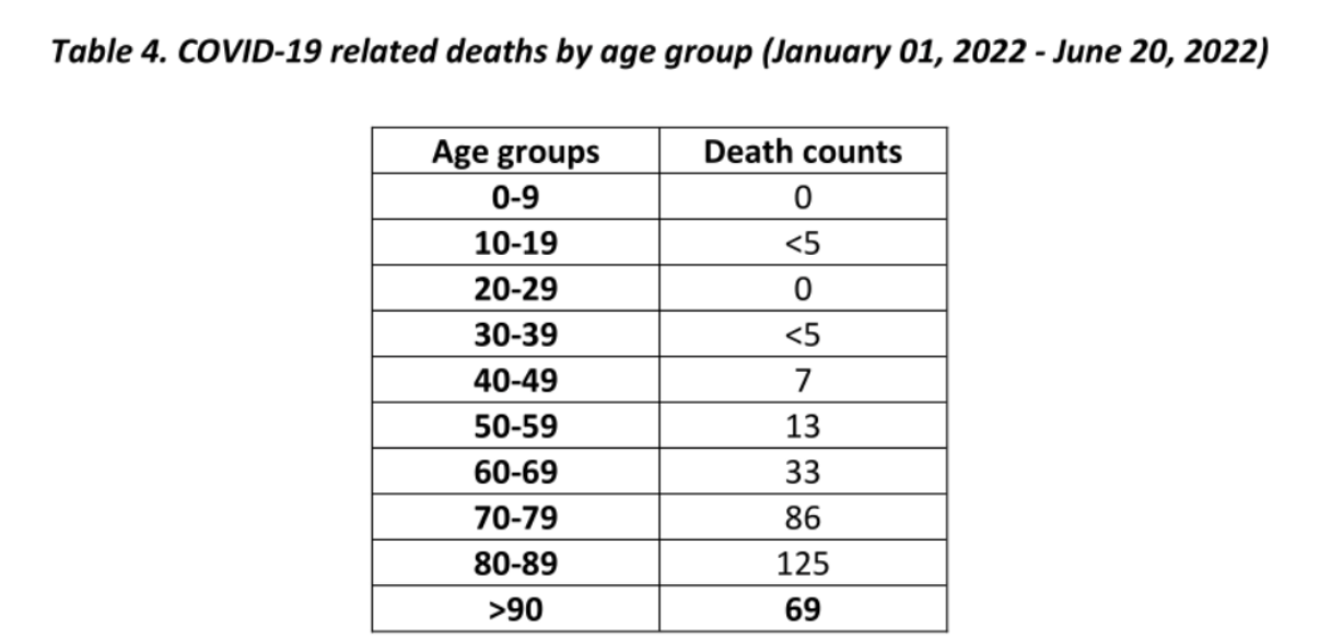 In response toa Freedom of Information request, the Department of Health compiled the following demographic information about COVID deaths that occurred between January 1, 2022 and June 20, 2022. The data have been released before, but these tables bring them together: