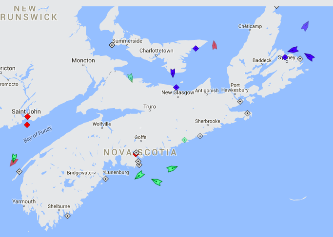 新斯科舍省附近海域,周二上午8:15。聚集在哈利法克斯周围的船只是抵达的赫尔马·P和离开的北方代表团以及巴尔卡尔德。聚集在悉尼周围的船只有巴斯克港渡轮、大西洋愿景号(抵达)和高地号(出发)以及邮轮马斯坦号(抵达)。地图:marinetraffic.com